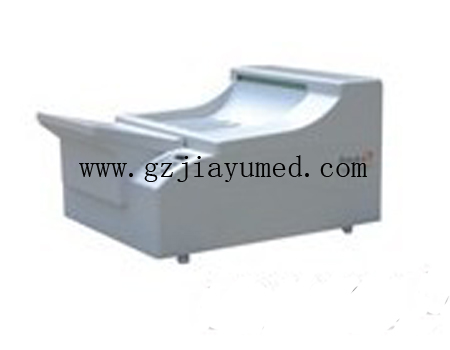 JY-1A医用胶片冲洗机性能特点 占地仅0.36m2,可以自由安装在任何一间暗室内,完全打消安装空间不够所造成的顾虑。较低的市场售价(比同类进口冲洗机低25%~40%),较少的药液消耗,较小的水量消耗,最适合每天10张以上的医疗机构使用,具有广阔的市场前景和经济效益。 采用高速冲洗胶片时,最快冲洗全过程只需90秒,能适应任何急诊要求及快速出片的医院使用。 仅为4.5升的显影、定影容量,可大大缩短更新药液的周期,使药液始终处于良好的活性状态。 由微电脑控制冲洗程序,两组电位器控制温度、速度,药液补充、可冲片、低液指标灯等各种预警功能自动完成控制,键盘指示灯能随时显示各种工作状态,只要放入一张胶片,机器就自动进行冲洗。 输片架结构、滚轴传动、电子控制、热风烘干、药液补充、循环系统等均为精心而成熟的设计,无须担心卡片、划伤、烘不干等问题。 虎丘影像独有的高性能吸水滚轴配合高效的风道式热风系统,确保在高速、大量、高湿度等环境下冲洗时,胶片照样快速高效的被烘干。 整机体积小,重量轻,便于移动,显影至烘干的轴架均可轻易取出,并可用水冲洗保养;即使是电器控制系统,只要打开进片暗箱下部封盖,也能进行维护保养。 为减少空气对药液的氧化,药槽中设计了防氧化盖,同时也降低了对室内空气环境的污染。 可以自由选择的两种出片方式:前出片和后出片方式:前出片是将整部机器放置在暗房内进行冲洗操作,胶片冲洗后会自动落在机器上部;后出片是将烘干出口轴架上的导向调整为向后出片状态,在明室与暗室之间打开一个8×48cm的孔,收片存放栏就安装在该孔(即出口处)的下部,取片时在明室。